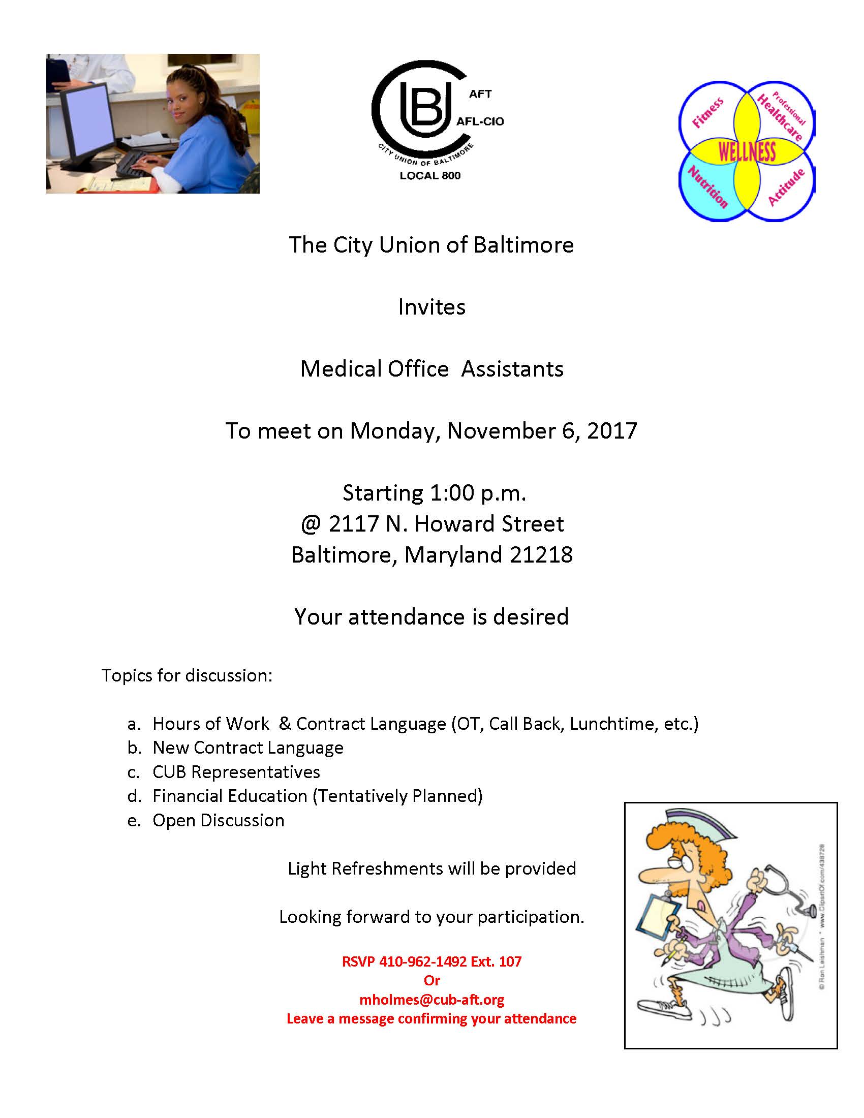 The City Union of Baltimore invites Medical Office Assistants to meet on Monday, November 6, 2017, starting 1:00 p.m. @ 2117 N. Howard Street, Baltimore, Maryland 21218. Your attendance is desired.
